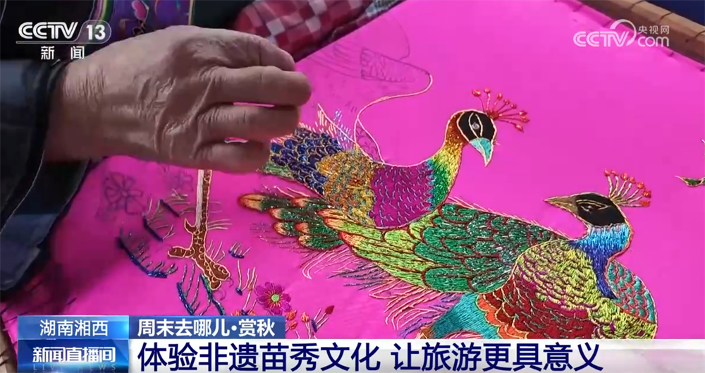 “下地干活式旅游”还能与非遗亲密接触,游客能够直观体验“五彩丝线”在绣绷上翻飞,村子里绣娘们不仅会演示针法,还会讲解苗绣图案背后的文化内涵。像“蝶花纹”代表苗族对自然的崇拜,“万字纹”寓意平安吉祥。在绣娘们的帮助下,游客们可以很轻松地完成穿针引线,在一针一线中感受苗绣的特色。